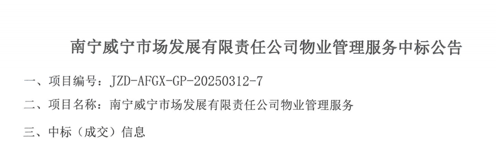 發(fā)布時間:2025-08-05南寧威寧市場發(fā)展有限責(zé)任公司物業(yè)管理服務(wù)中標(biāo)公告