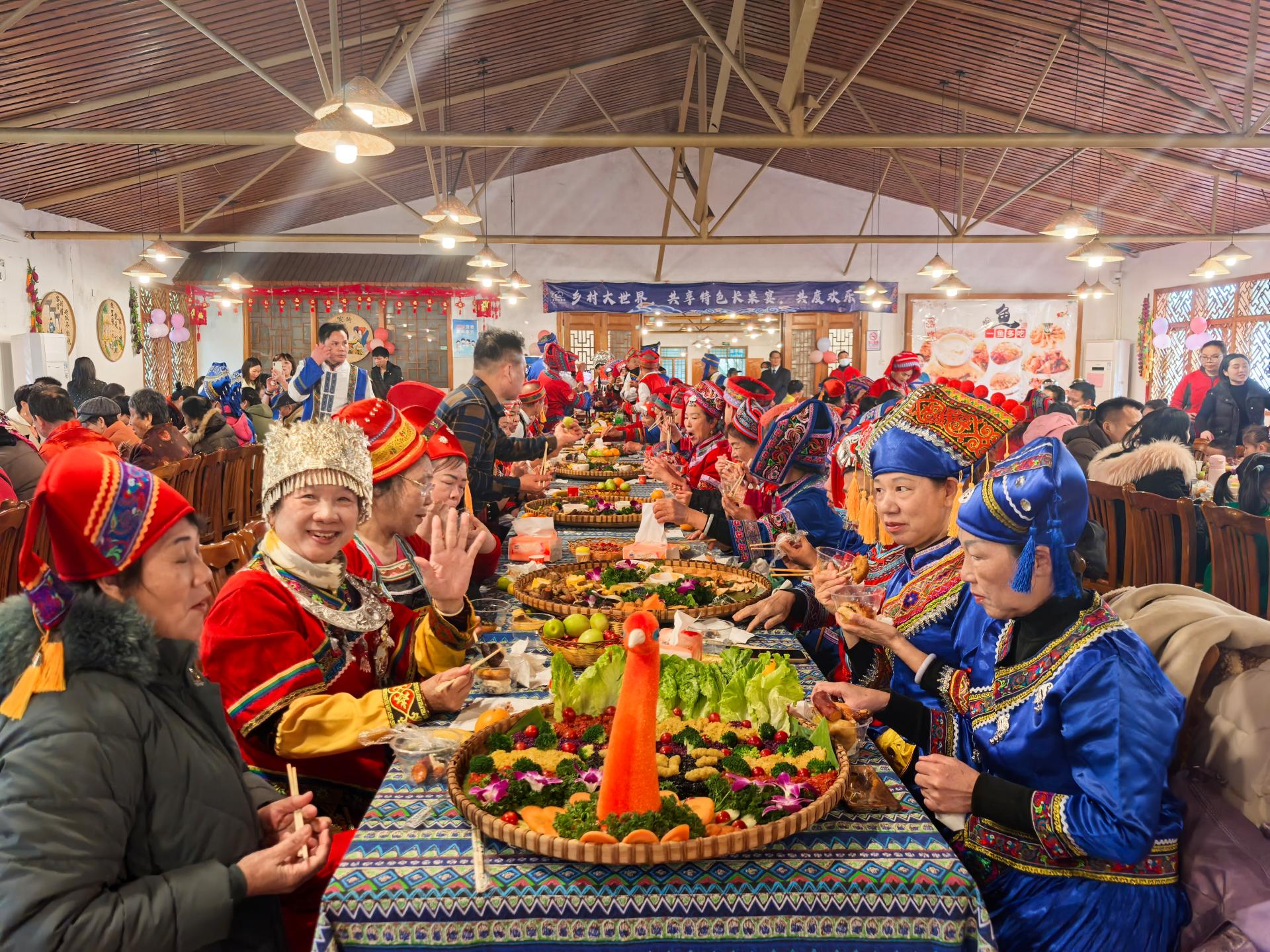 在鄉(xiāng)村大世界,特色長桌宴活動(dòng)吸引一眾市民游客參與,長桌上擺滿特色風(fēng)味美食,市民游客共敘情誼,繪就一幅民族交往交流交融的生動(dòng)圖景;同時(shí),對山歌、竹竿舞、拋繡球等系列民族特色活動(dòng)將活動(dòng)氛圍推向高潮,一場精彩的視聽盛宴獲得市民游客紛紛稱贊。