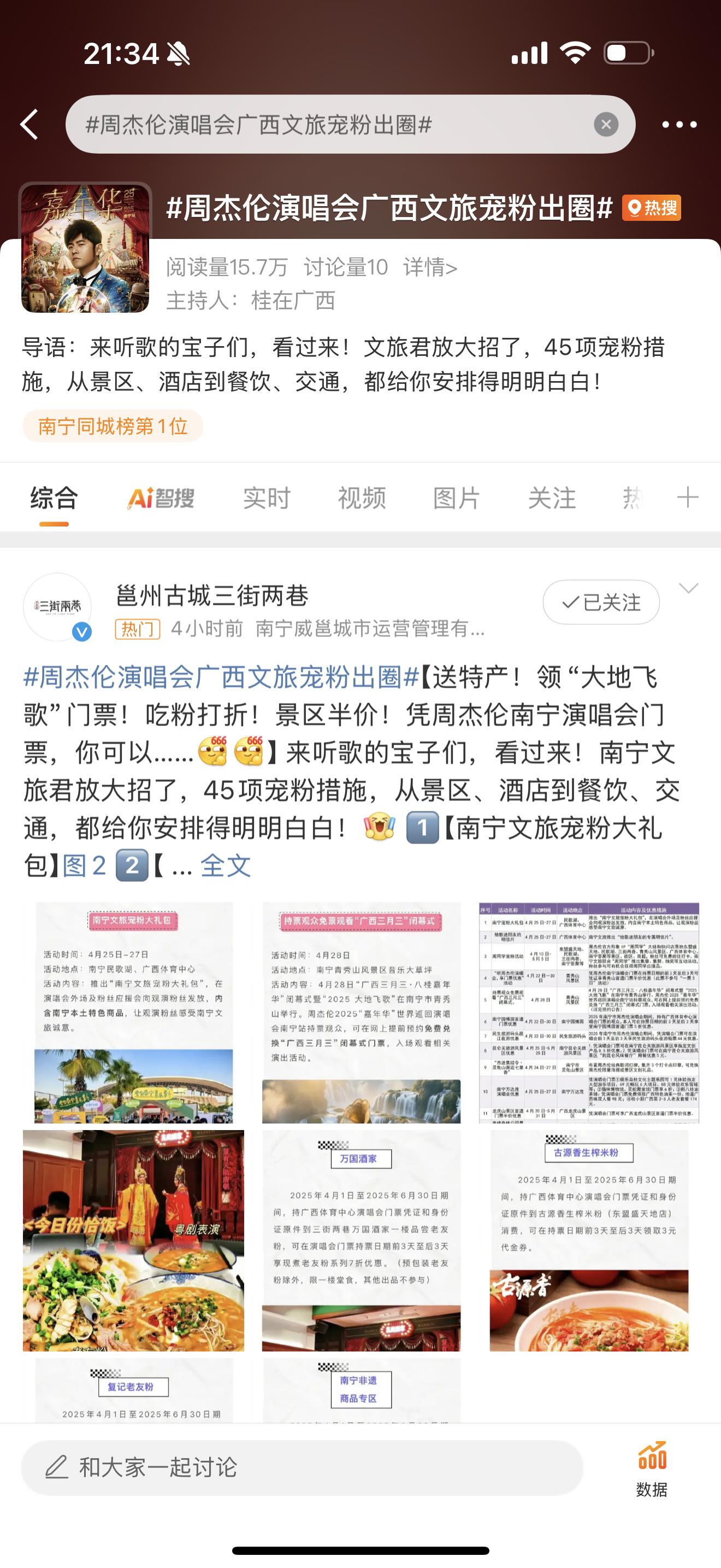 周杰倫南寧演唱會(huì)期間,南寧文旅集團(tuán)充分發(fā)揮新媒體宣傳優(yōu)勢(shì),通過南寧文旅集團(tuán)、廣西體育中心雙賬號(hào)矩陣,6個(gè)平臺(tái)共發(fā)布圖文及視頻58條,累計(jì)曝光量超1000萬,互動(dòng)量4.15萬人次。南寧文旅集團(tuán)策劃的“周杰倫粉絲禮遇”活動(dòng)登上新浪微博同城熱搜榜第一名話題“周杰倫演唱會(huì)廣西文旅寵粉出圈”的首條推薦位。