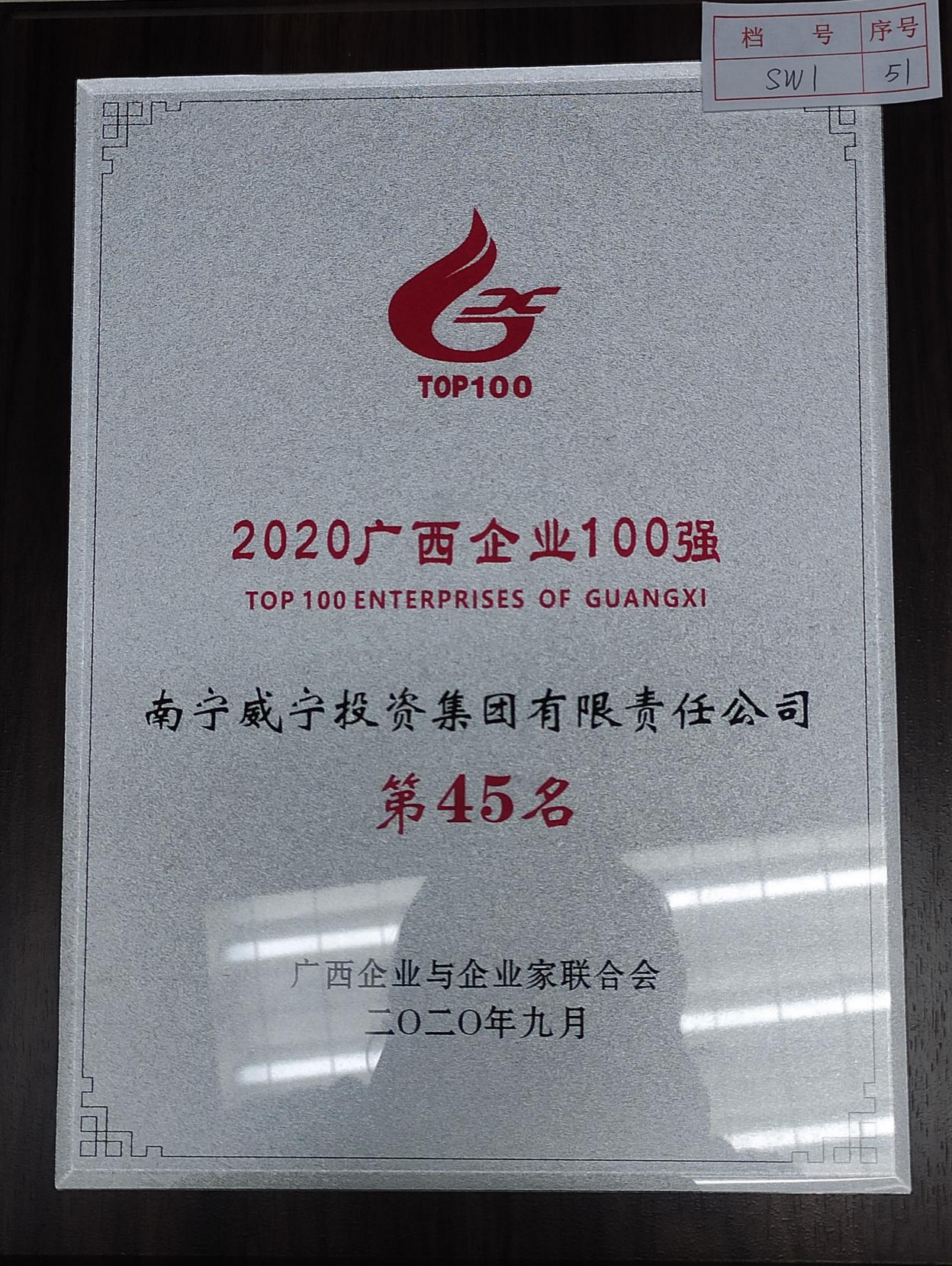 2020年9月,南寧威寧集團榮獲南寧市南寧市企業(yè)和企業(yè)家聯(lián)合會授予的2020年度廣西企業(yè)100強第45名