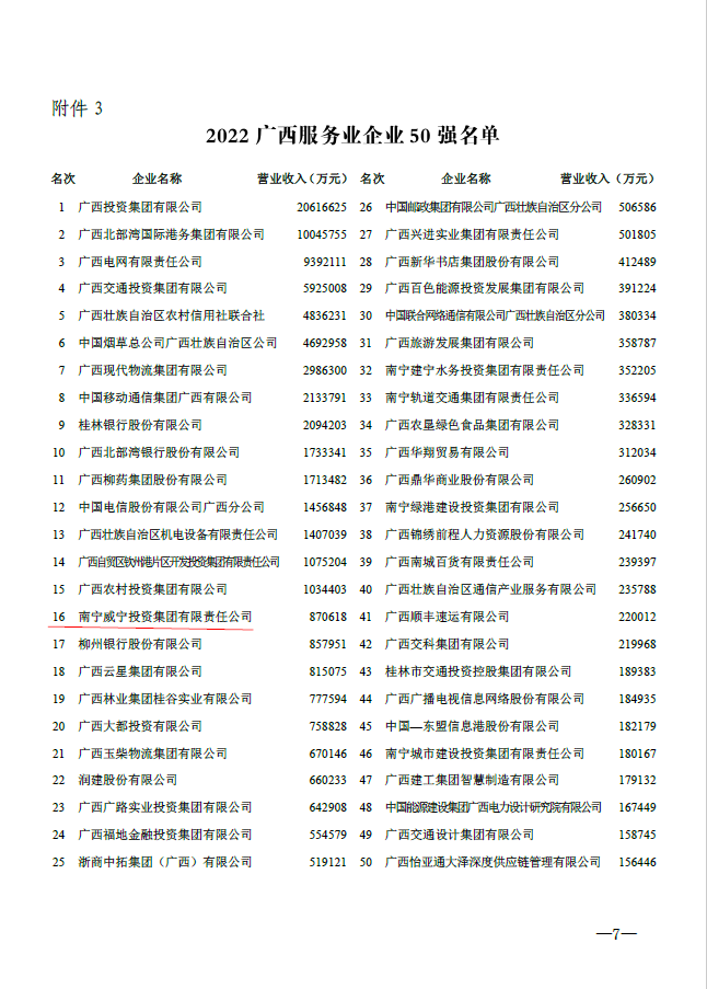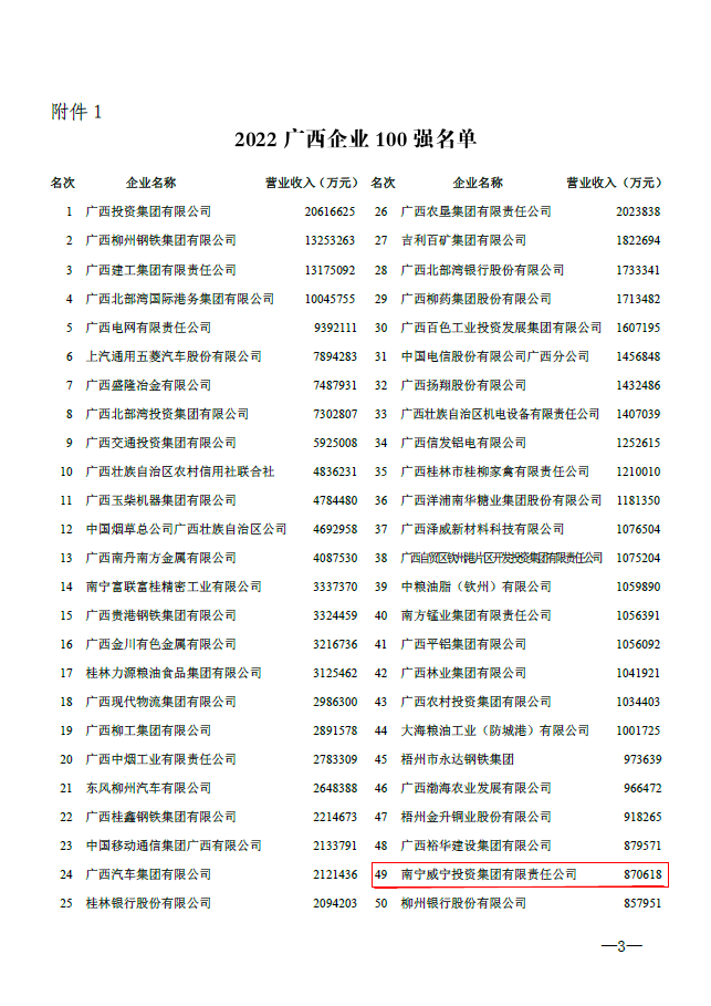 近日,廣西企業(yè)與企業(yè)家聯(lián)合會發(fā)布的2022廣西企業(yè)100強名單、制造業(yè)企業(yè)100強名單及服務業(yè)企業(yè)50強名單,南寧威寧集團入選“2022廣西企業(yè)100強名單”第49位,“2022廣西服務業(yè)企業(yè)50強名單”第16位。