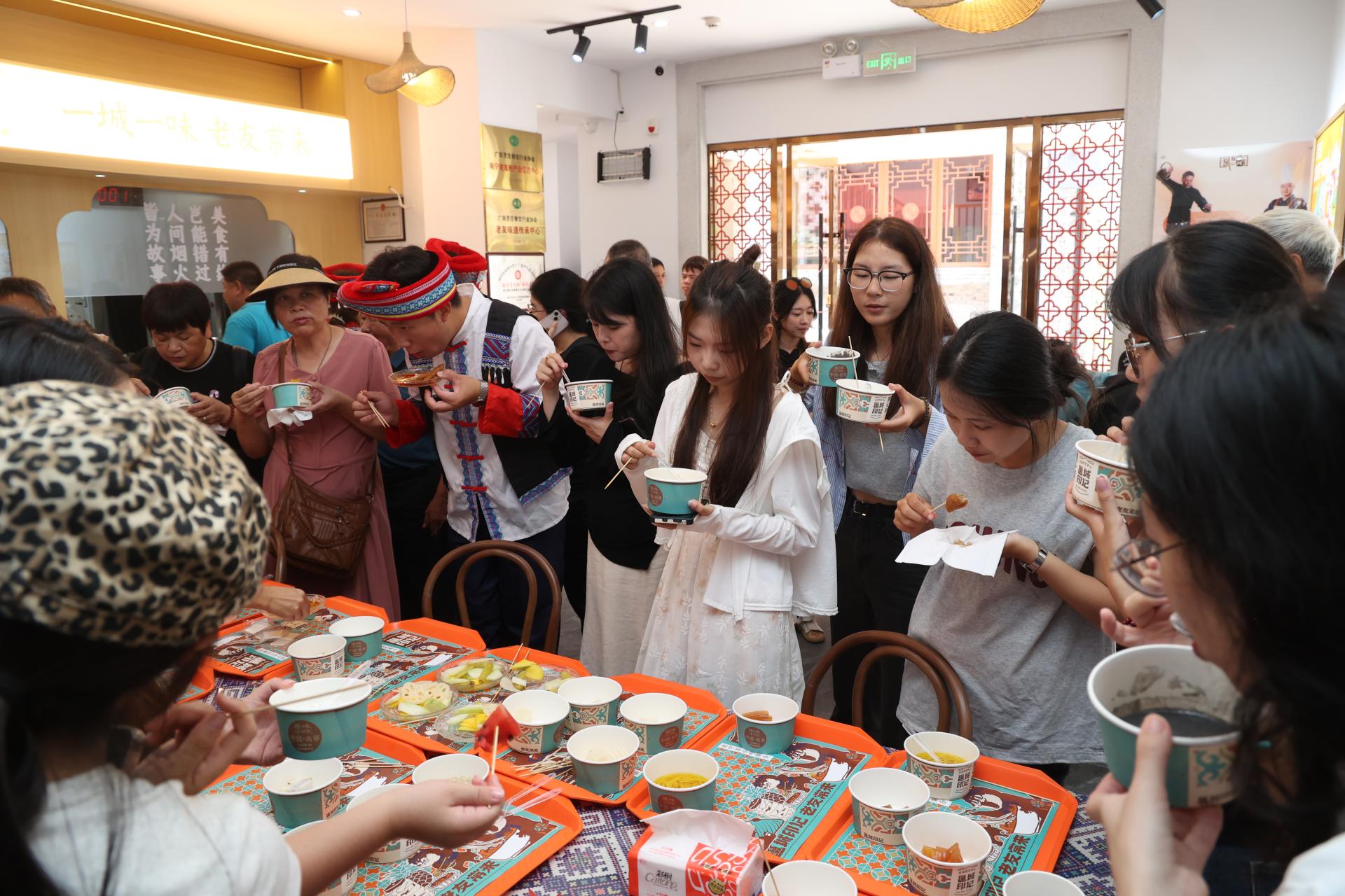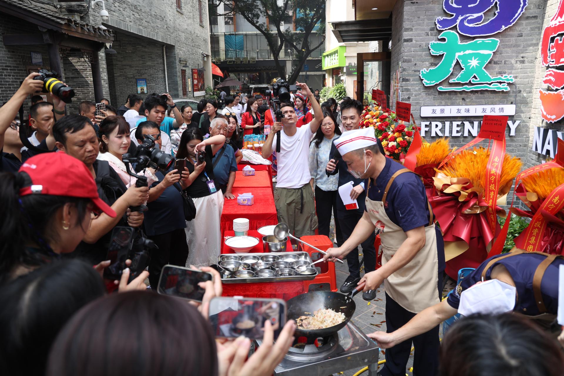 在開(kāi)火儀式現(xiàn)場(chǎng),豐富多樣的非遺體驗(yàn)和美食品鑒活動(dòng),吸引過(guò)路游客及市民駐足參與:老友粉技藝傳承人現(xiàn)場(chǎng)展現(xiàn)烹制南寧老友粉技藝,邀請(qǐng)游客品嘗正宗的老友粉;“邕城涼茶制作技藝”傳承人展示生沖雷公根涼茶制作過(guò)程;“點(diǎn)米成畫技藝”藝術(shù)家現(xiàn)場(chǎng)創(chuàng)作,為游客獻(xiàn)上視覺(jué)上的非遺技藝“大餐”。同時(shí),現(xiàn)場(chǎng)還設(shè)置了“嗦粉大作戰(zhàn)”“投食材互動(dòng)”“打卡有禮”等趣味互動(dòng)游戲,讓現(xiàn)場(chǎng)市民在互動(dòng)游玩中體驗(yàn)非遺美食文化。店內(nèi)豐富的文物器皿、精心設(shè)計(jì)的打卡點(diǎn)、豐富多樣的非遺美食和南寧名小吃,為現(xiàn)場(chǎng)市民提供了一段沉浸式的民俗技藝展示店參觀之旅。