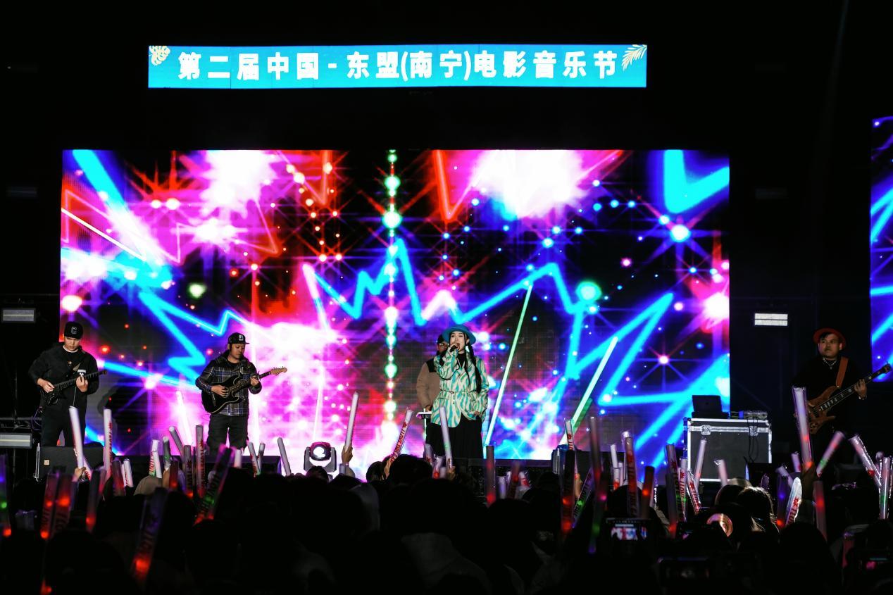 唱響冬日歡歌,共享音樂盛宴。12月14—15日,第二屆中國—東盟(南寧)電影音樂節(jié)在南寧學院、南寧職業(yè)技術(shù)大學完美開唱,兩所高校超一萬名學生參與。本屆音樂節(jié)以電影文化為主題,通過邀請區(qū)內(nèi)專業(yè)音樂組合、樂隊,攜手高校音樂愛好者,翻唱經(jīng)典電影歌曲、流行歌曲(熱歌)、本土特色原創(chuàng)音樂作品、部分東盟國家歌曲,為高校學子帶來融合唱跳、流行、說唱、搖滾等多樣化風格的演出,以歌會友、以歌傳情,相比去年,在內(nèi)容呈現(xiàn)上不僅彰顯更多電影元素,還充滿了濃濃的東盟風情,Miya樂團帶來的《泰friend》出自新民歌大會,將泰語和壯語以新民歌形式融合呈現(xiàn),表達了中國和東盟國家的深厚友誼,給學生觀眾帶來更加直觀、豐富的電影音樂文化體驗,以此促進不同文化之間的交流和融合。
