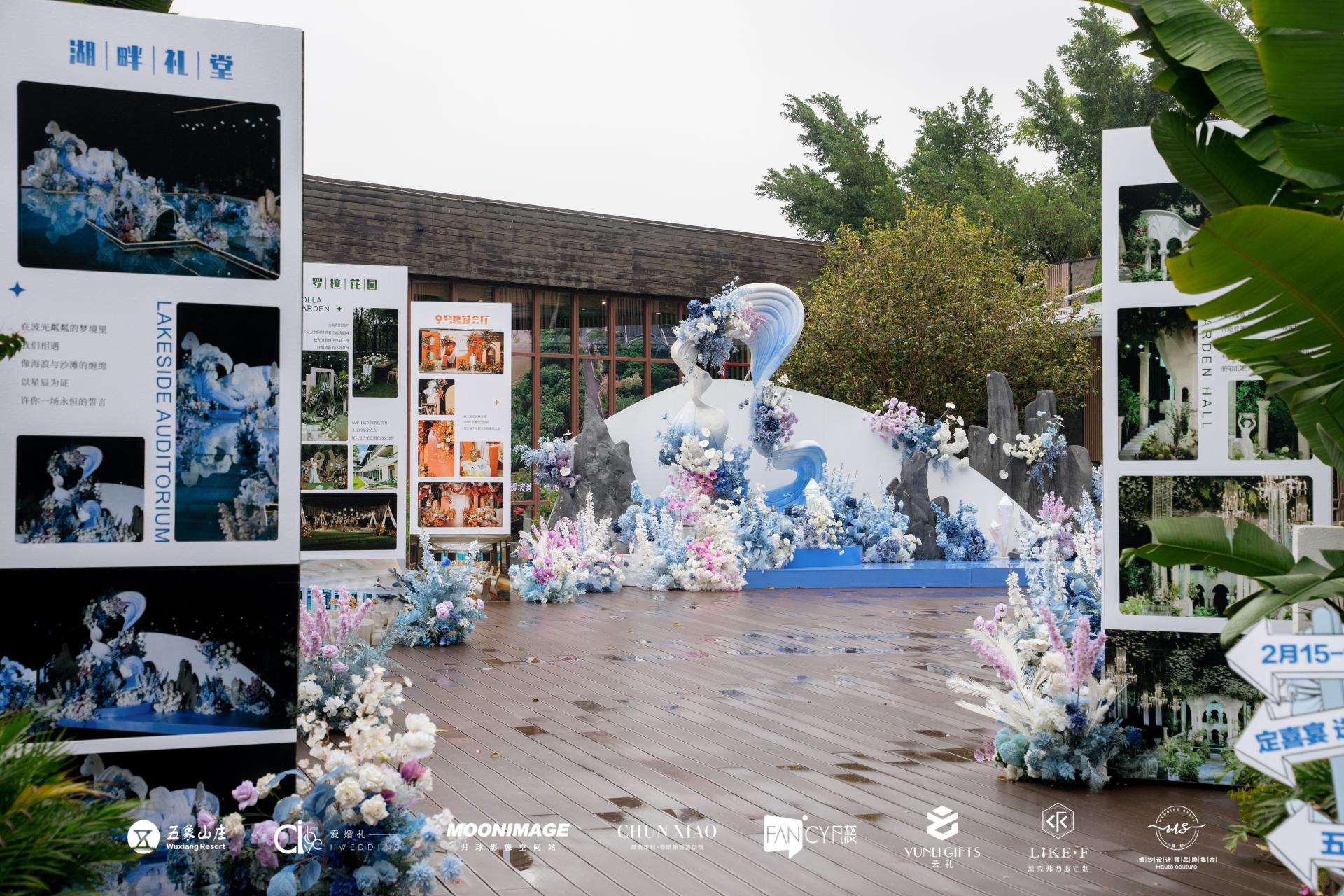 本次活動(dòng)在8號(hào)樓湖畔禮堂舉行。活動(dòng)現(xiàn)場(chǎng)布置得如夢(mèng)似幻,藍(lán)白色系的場(chǎng)景布置營(yíng)造出一種夢(mèng)幻、空靈、清澈、純凈的氛圍,令人仿佛置身于童話世界。湖畔禮堂以其獨(dú)特的水上儀式區(qū)和三面通透的玻璃墻體設(shè)計(jì),成為了現(xiàn)場(chǎng)的一大亮點(diǎn)。此外,五象山莊憑借無(wú)與倫比的自然景觀資源,精心打造了多個(gè)戶外草坪儀式區(qū),包括擁有超過(guò)1000平米的8號(hào)樓草坪和500平米的5號(hào)樓草坪,以及沉浸式婚禮堂花園廳、獨(dú)棟無(wú)柱式大宴會(huì)廳等,這些場(chǎng)地均以其開(kāi)闊的視野、優(yōu)美的自然景觀和獨(dú)特的布置風(fēng)格,為新人及賓客提供了獨(dú)一無(wú)二的背景畫(huà)卷,讓每一場(chǎng)婚禮都能享受到專(zhuān)屬的私密空間與定制服務(wù),贏得了新人們的一致好評(píng)。