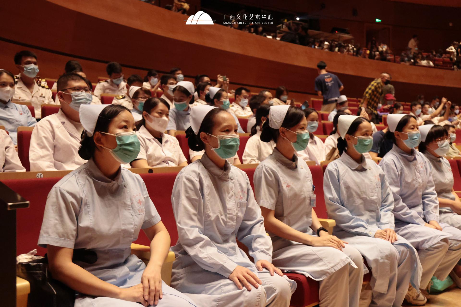 為充分發(fā)揮文藝“暖心”、文藝“聚力”的重要作用,實(shí)現(xiàn)疫情當(dāng)下“致敬英雄”,以實(shí)際行動(dòng)推動(dòng)演藝市場(chǎng)復(fù)蘇,今年,廣西文化藝術(shù)中心聯(lián)合南寧市衛(wèi)健委,特別邀請(qǐng)近500名醫(yī)護(hù)人員相聚劇場(chǎng)觀看大型民族舞劇《醒·獅》。這是廣西文化藝術(shù)中心自疫情發(fā)生以來(lái)連續(xù)第三年邀請(qǐng)抗疫一線醫(yī)護(hù)人員觀演,向我市奮戰(zhàn)在疫情一線的“最美逆行者”致敬。