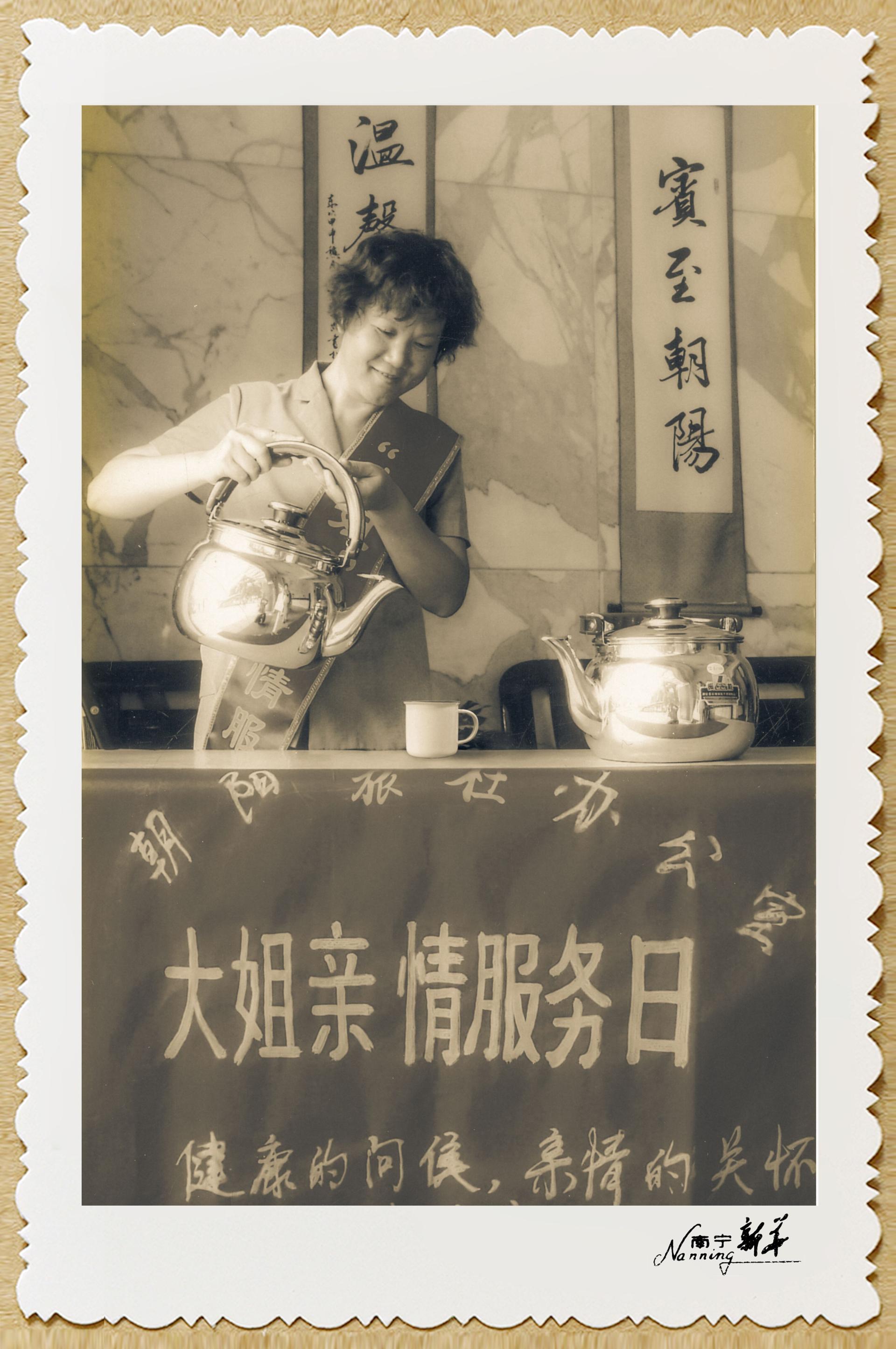 1993年,工作人員在大堂為客人提供消暑涼茶