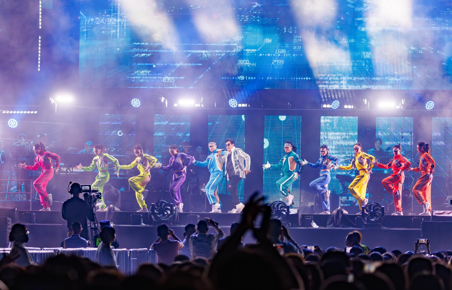 11月25日晚,譚詠麟用一首《水中傳奇》拉開本場演出的序幕,“永遠(yuǎn)25歲”的“譚校長”一出場便迎來數(shù)萬歌迷的熱情歡呼,氣氛十分熱烈。自20世紀(jì)60年代末溫拿樂隊紅透香港開始,譚詠麟的藝齡已橫跨60、70、80、90及新世紀(jì),所以當(dāng)晚的歌迷年齡有半數(shù)以上超過30歲。盡管年齡擺在面前,但全場歌迷依舊情緒高漲,紛紛打開手機(jī)手電筒動情地隨著音樂節(jié)奏盡情搖擺,猶如大型“蹦迪”現(xiàn)場。