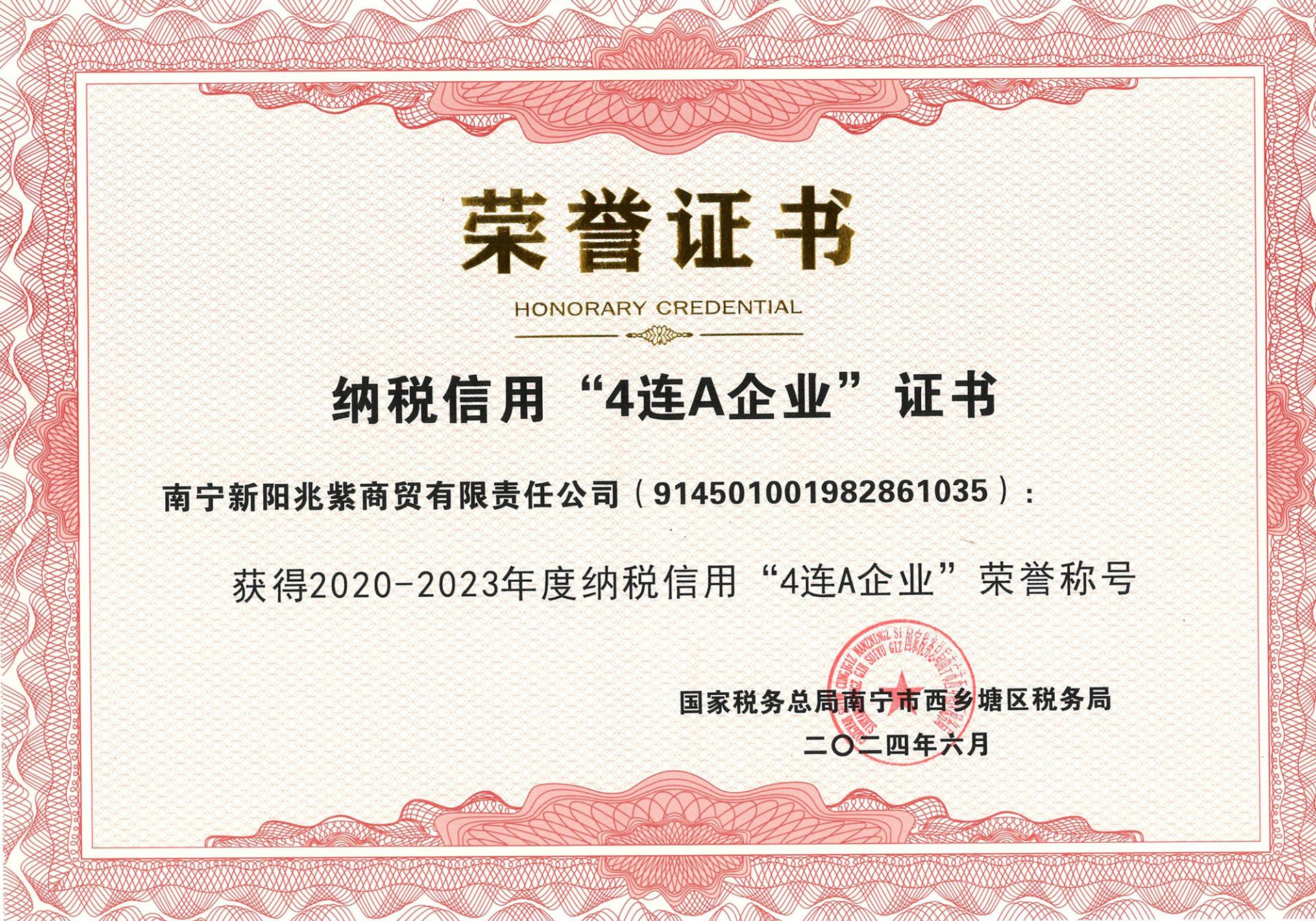此次榮獲納稅信用“4連A企業(yè)”榮譽(yù)稱(chēng)號(hào),不僅是對(duì)新陽(yáng)兆紫商貿(mào)公司堅(jiān)持“誠(chéng)信經(jīng)營(yíng)、規(guī)范管理”的肯定,同時(shí)也有力提升了企業(yè)信譽(yù)。