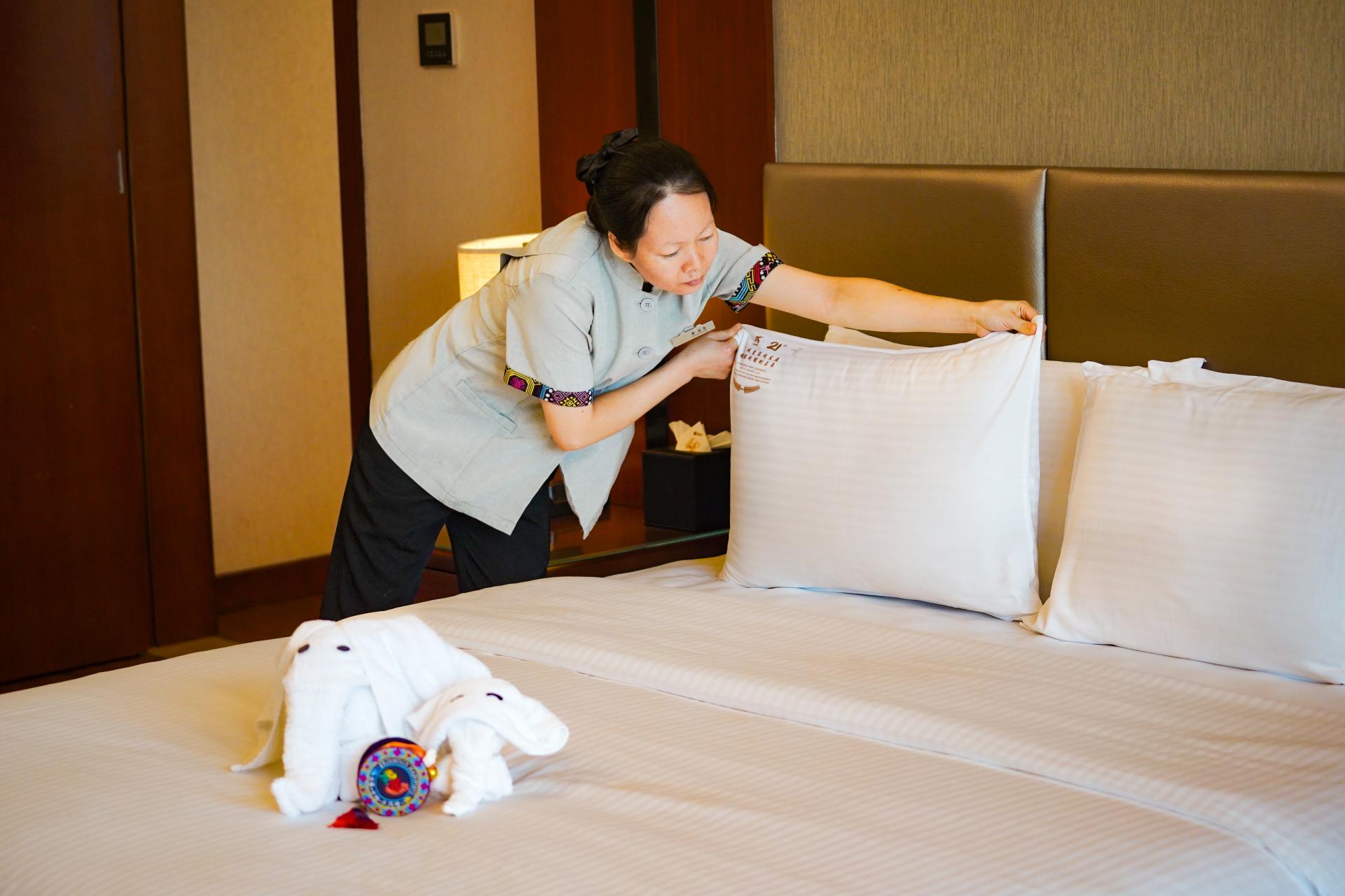 客房服務(wù)溫馨體貼。為保障參會(huì)賓客們擁有一個(gè)舒適的安睡環(huán)境,山莊客房部提前做好客房衛(wèi)生清潔、消毒和通風(fēng),同時(shí)增配不同類型的枕頭,并強(qiáng)化VIP服務(wù),提供24小時(shí)管家式服務(wù),與賓客的溝通做到準(zhǔn)確及時(shí),滿足賓客們的個(gè)性化需求,讓每位入住的客人感受到尊重和真誠(chéng)。