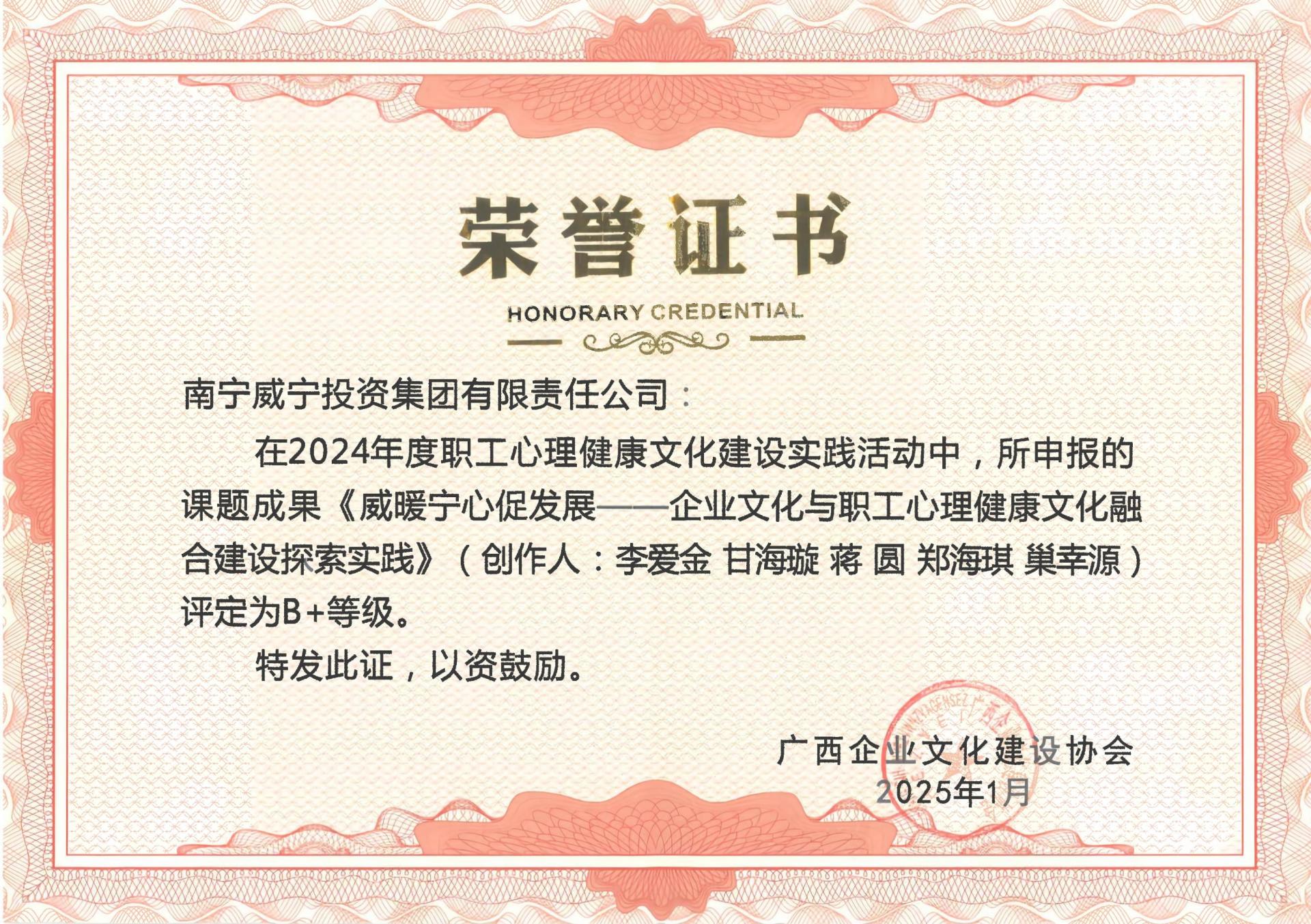 此外,南寧威寧集團(tuán)申報(bào)的職工心理健康文化建設(shè)實(shí)踐課題成果《威暖寧心促發(fā)展——企業(yè)文化與職工心理健康文化融合建設(shè)探索實(shí)踐》獲評(píng)B+等級(jí)。