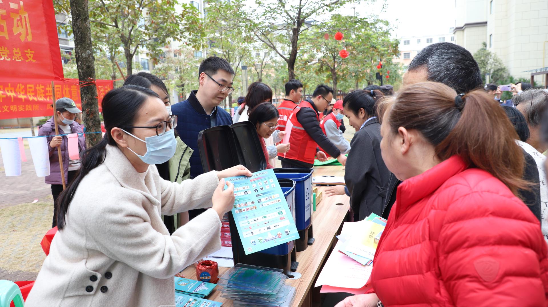 在垃圾分類活動區(qū),志愿者們?yōu)榇蠹倚x并詳細講解了生活垃圾分類的優(yōu)點以及相關(guān)政策。為了讓大家更直觀地理解,志愿者們還手持各類垃圾道具,如廢舊電池、塑料瓶、菜葉、用過的紙巾等,現(xiàn)場提問居民該如何分類投放,居民們紛紛踴躍參與,積極回答問題,現(xiàn)場氣氛熱烈非凡。