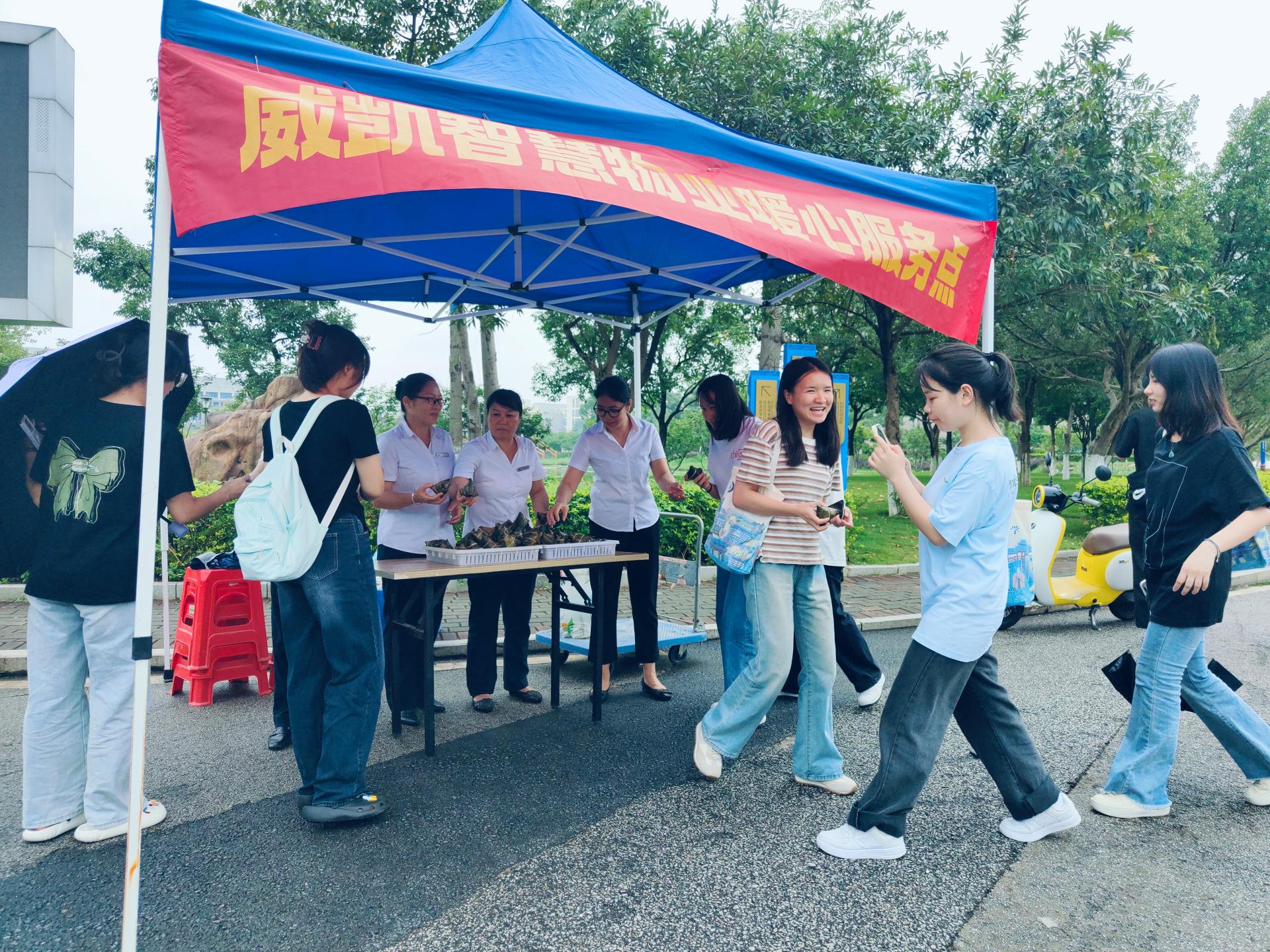 在2024年廣西三月三期間,公司以“八桂鄰里同樂,壯鄉(xiāng)歌舞飛揚(yáng)”為主題,服務(wù)基層開展了6場特色活動(dòng),以住宅業(yè)態(tài)為服務(wù)對象的服務(wù)中心,在小區(qū)開展拋繡球、唱山歌、跳竹竿、民族服飾展示互動(dòng)等民俗體驗(yàn)活動(dòng);在南寧學(xué)院“三月三”校園民俗文化節(jié)上,公司10多名宿管、保潔阿姨們搖身一變成為一支民族特色“舞蹈團(tuán)隊(duì)”亮相,與2萬名師生開心歌唱、歡度佳節(jié)。