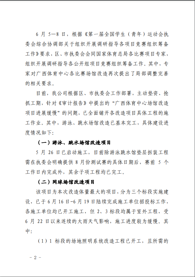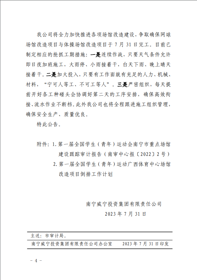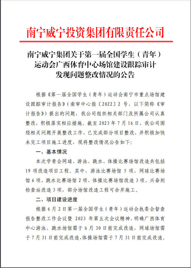 南寧威寧集團(tuán)關(guān)于第一屆全國學(xué)生(青年)運動會廣西體育中心場館建設(shè)跟蹤審計發(fā)現(xiàn)問題整改情況的公告