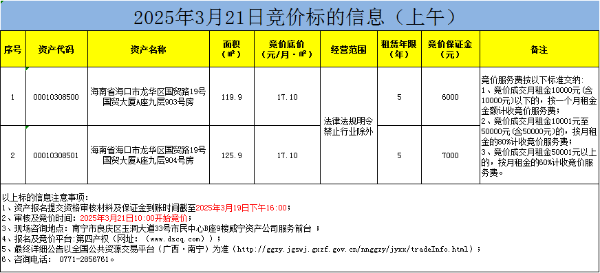 2025年3月21日競(jìng)價(jià)標(biāo)的信息(線上競(jìng)價(jià))