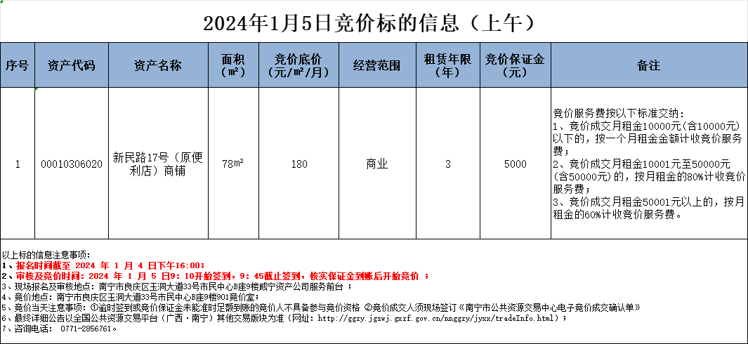 2024年1月5日競價(jià)標(biāo)的信息