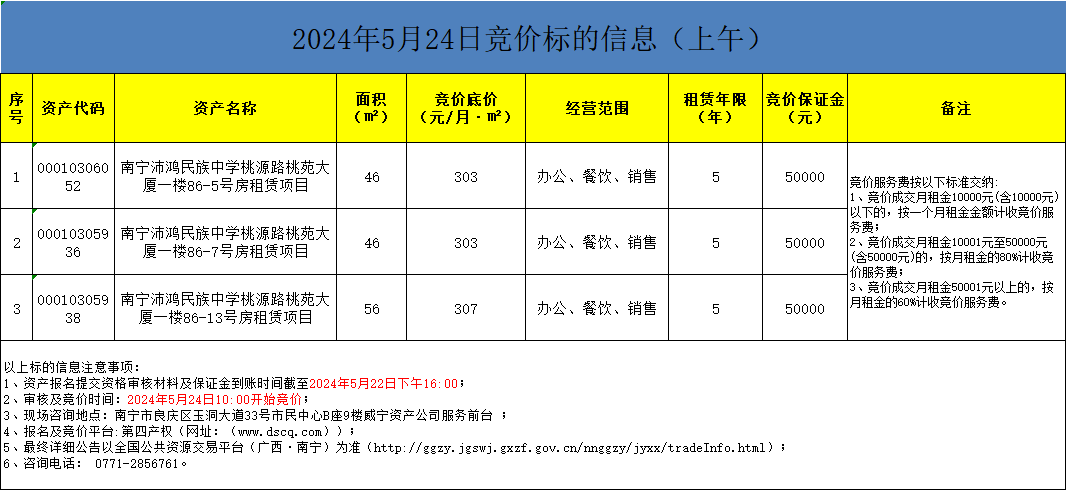 2024年5月24日競(jìng)價(jià)標(biāo)的信息(線上競(jìng)價(jià))