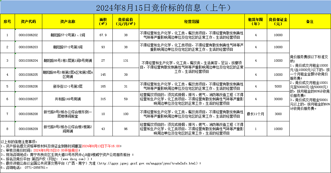 2024年8月15日競(jìng)價(jià)標(biāo)的信息(線上競(jìng)價(jià))