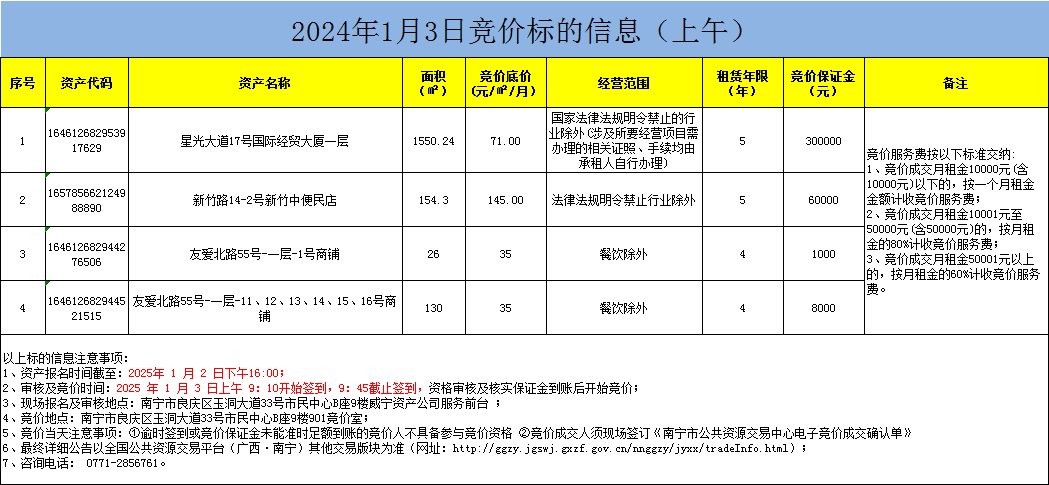 2025年1月3日競價標的信息(現(xiàn)場競價)