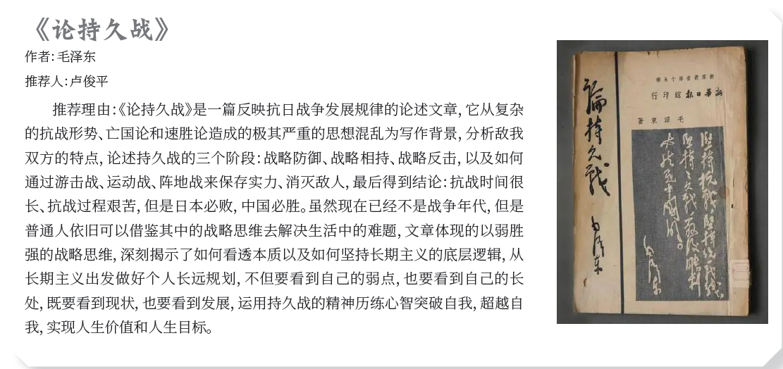 作者:毛澤東 推薦人:盧俊平 推薦理由:《論持久戰(zhàn)》是一篇反映抗日戰(zhàn)爭發(fā)展規(guī)律的論述文章,它從復雜 的抗戰(zhàn)形勢、亡國論和速勝論造成的極其嚴重的思想混亂為寫作背景,分析敵我 雙方的特點,論述持久戰(zhàn)的三個階段:戰(zhàn)略防御、戰(zhàn)略相持、戰(zhàn)略反擊,以及如何 通過游擊戰(zhàn)、運動戰(zhàn)、陣地戰(zhàn)來保存實力、消滅敵人,最后得到結論:抗戰(zhàn)時間很 長、抗戰(zhàn)過程艱苦,但是日本必敗,中國必勝。雖然現(xiàn)在已經(jīng)不是戰(zhàn)爭年代,但是 普通人依舊可以借鑒其中的戰(zhàn)略思維去解決生活中的難題,文章體現(xiàn)的以弱勝 強的戰(zhàn)略思維,深刻揭示了如何看透本質以及如何堅持長期主義的底層邏輯,從 長期主義出發(fā)做好個人長遠規(guī)劃,不但要看到自己的弱點,也要看到自己的長 處,既要看到現(xiàn)狀,也要看到發(fā)展,運用持久戰(zhàn)的精神歷練心智突破自我,超越自 我,實現(xiàn)人生價值和人生目標。
