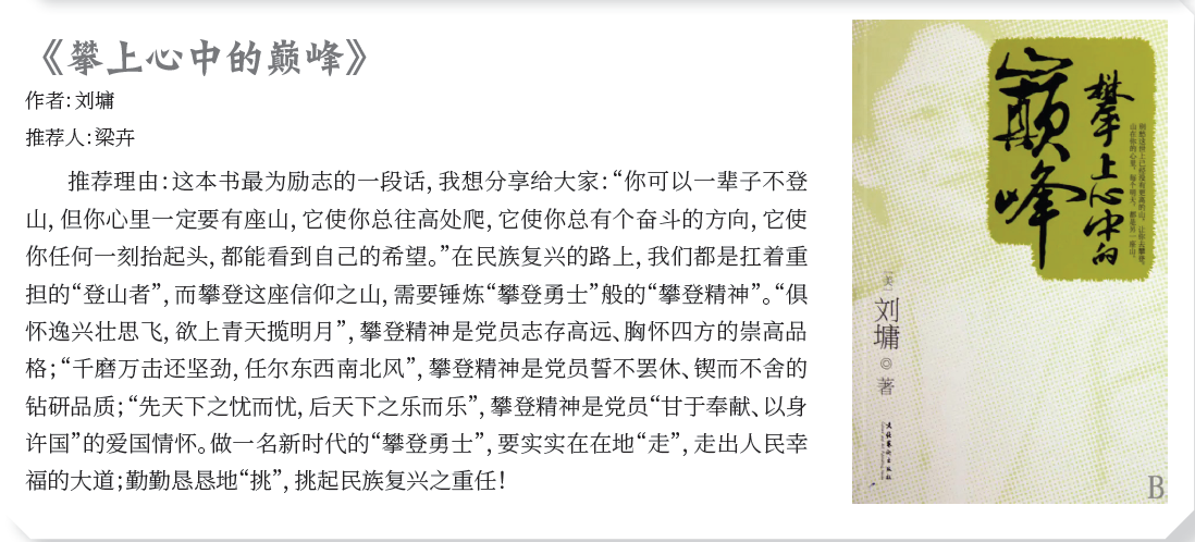 作者:劉墉 推薦人:梁卉 推薦理由:這本書最為勵志的一段話,我想分享給大家:“你可以一輩子不登 山,但你心里一定要有座山,它使你總往高處爬,它使你總有個奮斗的方向,它使 你任何一刻抬起頭,都能看到自己的希望?!痹诿褡鍙团d的路上,我們都是扛著重 擔的“登山者”,而攀登這座信仰之山,需要錘煉“攀登勇士”般的“攀登精神”。“俱 懷逸興壯思飛,欲上青天攬明月”,攀登精神是黨員志存高遠、胸懷四方的崇高品 格;“千磨萬擊還堅勁,任爾東西南北風”,攀登精神是黨員誓不罷休、鍥而不舍的 鉆研品質;“先天下之憂而憂,后天下之樂而樂”,攀登精神是黨員“甘于奉獻、以身 許國”的愛國情懷。做一名新時代的“攀登勇士”,要實實在在地“走”,走出人民幸 福的大道;勤勤懇懇地“挑”,挑起民族復興之重任!
