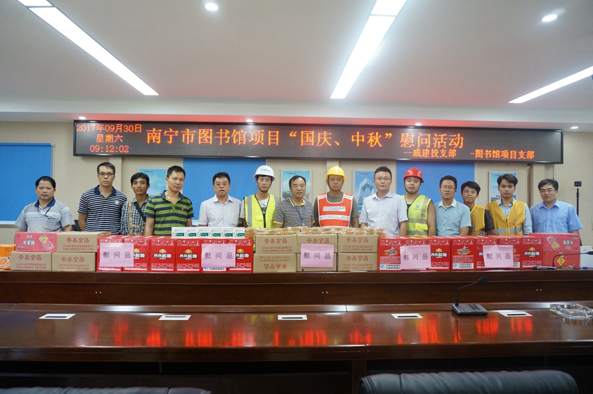 在國慶節(jié)、中秋節(jié)到來之際,為讓奮斗在項目一線的同志感受到黨的溫暖,2017年9月30日上午,威寧建投公司黨支部聯(lián)合南寧市圖書館項目黨支部到項目現(xiàn)場開展“雙節(jié)”慰問活動,為各隊伍一線工人送上節(jié)日的慰問。