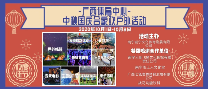 2020年10月1日至8日,威寧文體公司運營管理的廣西體育中心將舉辦“拾年共嬋娟”——中秋、國慶合家歡戶外活動,進一步助推公益賽事發(fā)展,豐富廣西體育中心活動內(nèi)容,讓市民朋友更近距離了解廣西體育中心各場館,更積極參與全民運動,用體育運動的活力為中秋國慶增加熱烈的節(jié)日氛圍,為市民朋友送上不一樣的中秋國慶“大禮包”。