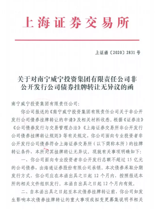 2020年12月17日,集團(tuán)收到上海證券交易所(以下簡(jiǎn)稱“上交所”)《關(guān)于對(duì)南寧威寧投資集團(tuán)有限責(zé)任公司非公開發(fā)行公司債券掛牌轉(zhuǎn)讓無(wú)異議的函》,成功申報(bào)15億元私募公司債發(fā)行額度。