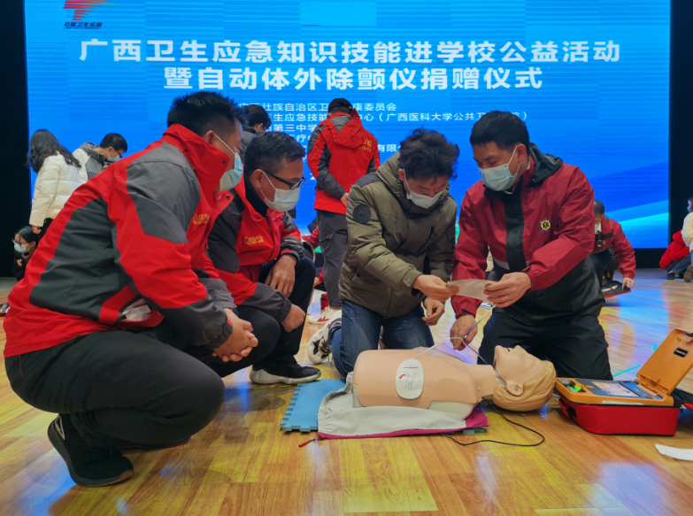 2020年12月16日,自治區(qū)衛(wèi)生健康委聯(lián)合南寧急救醫(yī)療中心舉辦衛(wèi)生應(yīng)急知識(shí)技能進(jìn)學(xué)校公益活動(dòng)暨自動(dòng)體外除顫儀捐贈(zèng)儀式,威寧文體公司副總經(jīng)理黃慶全帶隊(duì)參加活動(dòng),并代表公司受贈(zèng)自動(dòng)體外除顫儀(AED)。