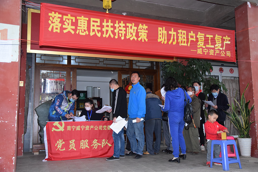 復(fù)工復(fù)產(chǎn)政策指導(dǎo)辦理不動(dòng)產(chǎn)權(quán)證自新冠疫情發(fā)生以來,威寧資產(chǎn)公司在南寧市委市政府以及市國(guó)資委、南寧威寧集團(tuán)大力來支持下,積極響應(yīng)國(guó)家“六穩(wěn)”“六?!碧?hào)召,堅(jiān)持以務(wù)實(shí)高效的工作作風(fēng)詮釋使命擔(dān)當(dāng),全面履行國(guó)有企業(yè)的經(jīng)濟(jì)責(zé)任、政治責(zé)任和社會(huì)責(zé)任,為奪取疫情防控和經(jīng)濟(jì)社會(huì)發(fā)展雙勝利貢獻(xiàn)力量。內(nèi)外齊力,減租免租顯擔(dān)當(dāng)。受新冠肺炎疫情影響,不少承租商戶延遲復(fù)工時(shí)間,租金支出壓力巨大。面對(duì)疫情,公司黨委要求業(yè)務(wù)部