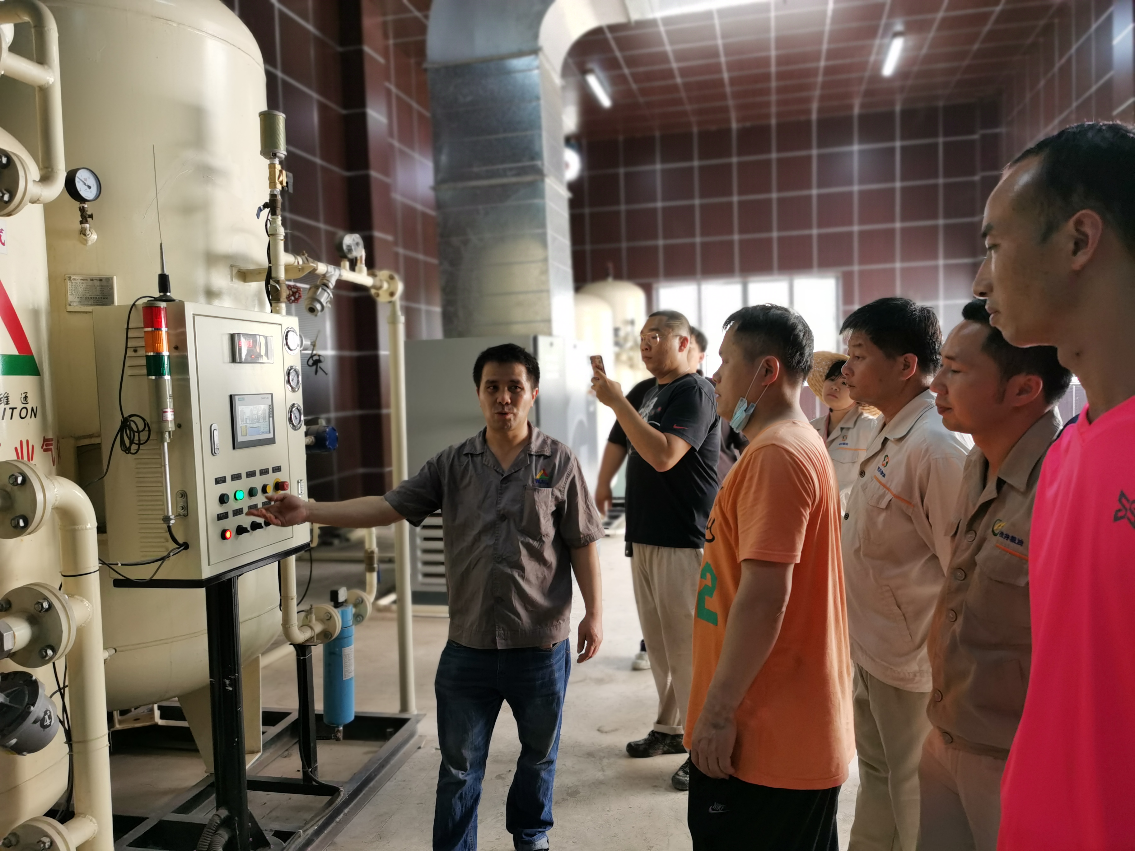 培訓(xùn)現(xiàn)場(chǎng)糧庫(kù)工作人員在查看充氮設(shè)備罐體分離篩工作情況“我們這套制氮機(jī)組具有氮?dú)鉂舛茸詣?dòng)檢測(cè)、設(shè)備故障提示報(bào)警等功能,操作人員在系統(tǒng)軟件中設(shè)定目標(biāo)倉(cāng)房需達(dá)到的氮?dú)鉂舛戎怠毫χ档葏?shù)……”近日,南寧威寧集團(tuán)下轄威寧市場(chǎng)公司的儲(chǔ)備糧公司五象糧庫(kù),組織進(jìn)行充氮?dú)庹{(diào)設(shè)備機(jī)組安全檢查和維護(hù)保養(yǎng),并借此機(jī)會(huì)邀請(qǐng)維護(hù)設(shè)備的技術(shù)人員對(duì)倉(cāng)儲(chǔ)科全體員工開(kāi)展充氮?dú)庹{(diào)設(shè)備安全操作實(shí)踐培訓(xùn)。培訓(xùn)中,技術(shù)人員就充氮?dú)庹{(diào)設(shè)備的