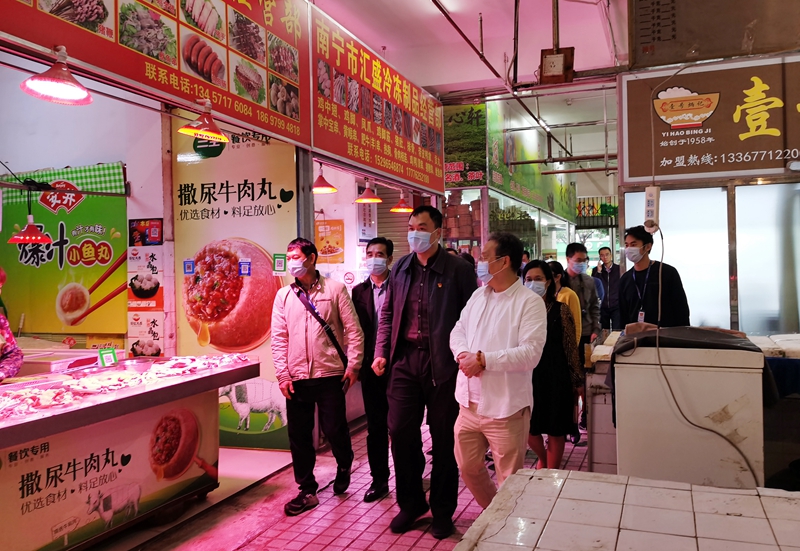 圖檢查現(xiàn)場(chǎng)2021年4月8日,南寧市西鄉(xiāng)塘區(qū)人民政府代區(qū)長(zhǎng)韋翯鈺到威寧市場(chǎng)公司所屬的水街市場(chǎng)開(kāi)展?fàn)巹?chuàng)全國(guó)文明典范城市、迎接全國(guó)衛(wèi)生城市復(fù)審工作指導(dǎo)。韋翯鈺深入市場(chǎng)各行業(yè),實(shí)地感受創(chuàng)建全國(guó)文明城市、全國(guó)衛(wèi)生城市宣傳氛圍,仔細(xì)聽(tīng)取市場(chǎng)負(fù)責(zé)人關(guān)于水街市場(chǎng)經(jīng)營(yíng)管理、衛(wèi)生清潔和消防安全等工作開(kāi)展情況的介紹,并詳細(xì)詢(xún)問(wèn)市場(chǎng)肉類(lèi)、水產(chǎn)品、燒鹵熟食等食品價(jià)格、進(jìn)貨渠道及供需情況,重點(diǎn)查看農(nóng)貿(mào)市場(chǎng)豬肉檔動(dòng)物檢疫合格