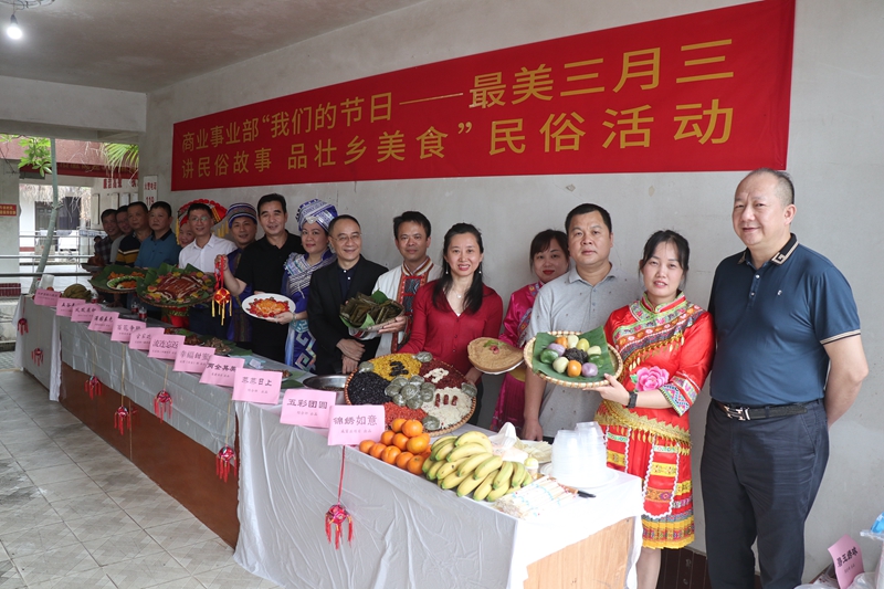 圖活動(dòng)現(xiàn)場(chǎng)圖 壯家員工韋雨波分享民族美食2021年4月12日中午,威寧市場(chǎng)公司商業(yè)事業(yè)部組織壯、漢族職工代表,開(kāi)展三月三民俗文化活動(dòng),弘揚(yáng)壯鄉(xiāng)傳統(tǒng)民族文化?;顒?dòng)現(xiàn)場(chǎng),來(lái)自各部門(mén)的“阿哥”和“阿妹”們,身穿壯族特色服裝歡聚一堂,壯族員工江桂寧和陳倩卿分享了壯族民間傳統(tǒng)故事《百鳥(niǎo)衣》《月亮妹》。員工們拿出親手烹飪的民族特色美食進(jìn)行比拼,五色糯米飯、艾葉糍粑、油茶……,一道道精心制作的家鄉(xiāng)菜,將民族文化