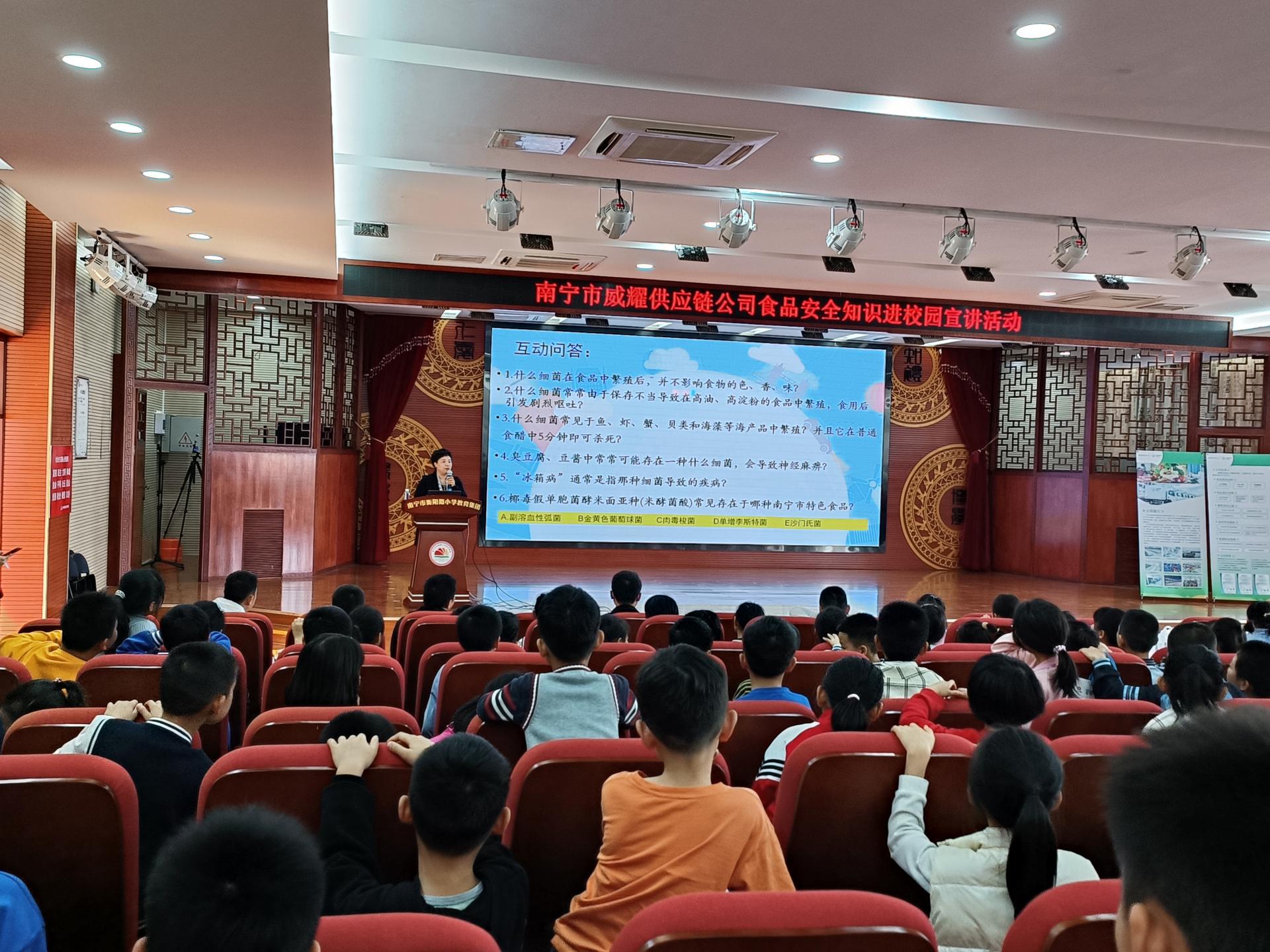 “發(fā)芽的土豆不能吃?!薄皝喯跛猁}會引發(fā)中毒現(xiàn)象?!?.....在同學們積極的回答問題聲中,3月2日,由威耀供應鏈公司牽頭,會同在庫優(yōu)質(zhì)供應商組織開展的“食品安全宣講”進校園系列活動首站在南寧市衡陽路小學(五象校區(qū))成功開講。南寧市衡陽路小學(五象校區(qū))是本次系列活動的第一站,本站主講老師是南寧市疾控中心營養(yǎng)學專家、國家注冊營養(yǎng)師、國家二級健康管理師張靜。張靜通過如...