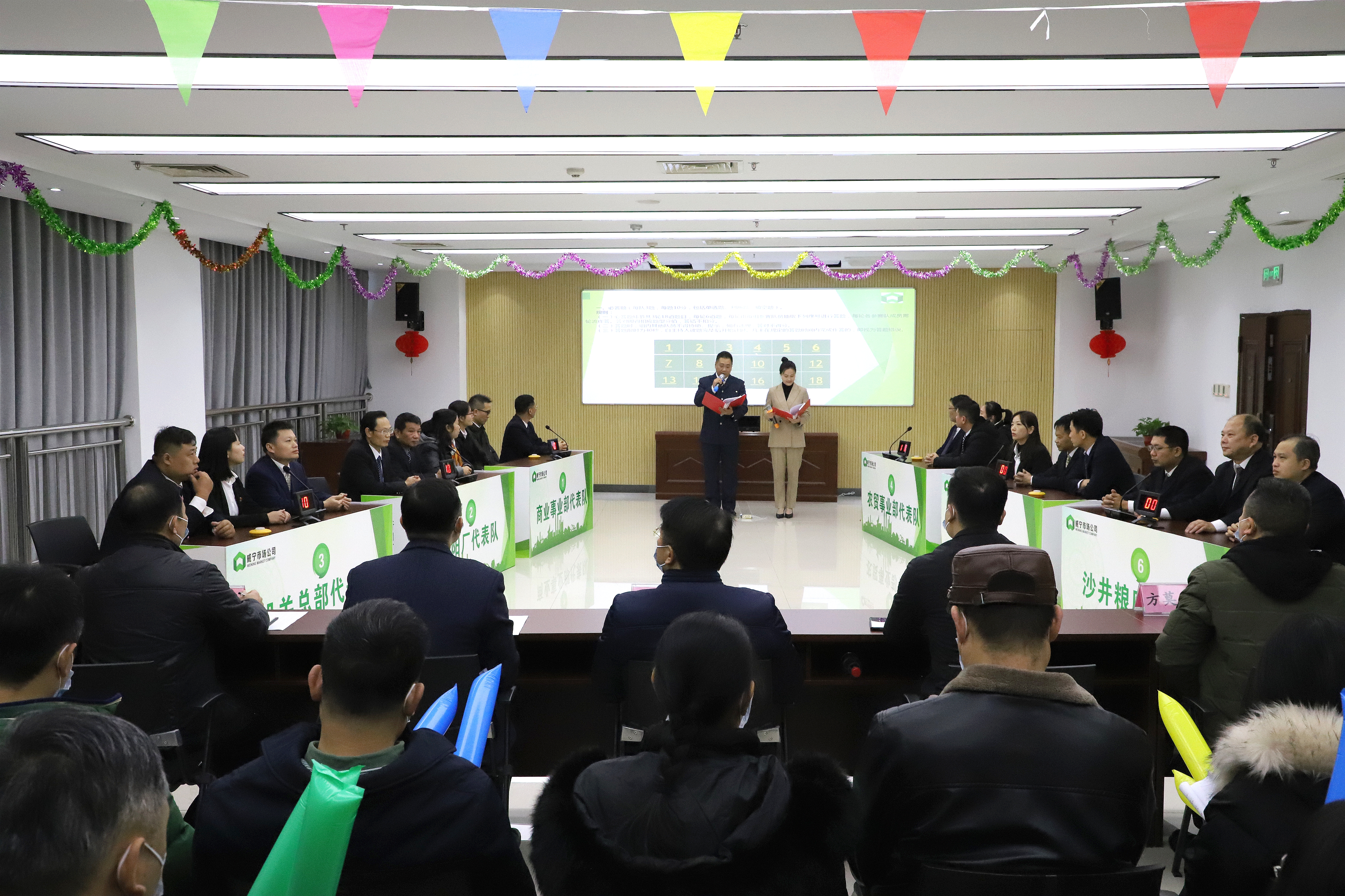 活動(dòng)現(xiàn)場集團(tuán)副總經(jīng)理韋義勇作指導(dǎo)講話選手踴躍答題集團(tuán)副總經(jīng)理韋義勇頒發(fā)競賽一等獎(jiǎng)公司黨委書記、董事長李林頒發(fā)競賽二等獎(jiǎng)公司總經(jīng)理陳志光頒發(fā)競賽三等獎(jiǎng)為深入學(xué)習(xí)貫徹新修訂的《中華人民共和國安全生產(chǎn)法》,進(jìn)一步提升廣大員工知法、守法、用法意識(shí),全面營造良好的學(xué)法用法氛圍,2021年12月28日,威寧市場公司開展安全生產(chǎn)法知識(shí)競賽,來自公司總部、事業(yè)部及監(jiān)管單位六支隊(duì)伍開展激烈比拼,南寧威寧集團(tuán)副總經(jīng)理