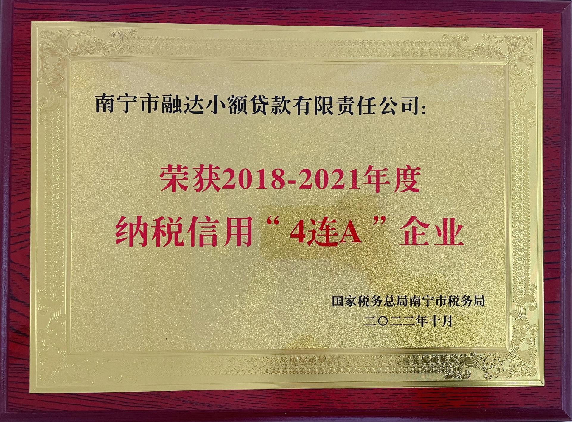 融達小貸公司榮獲納稅信用“4連A”企業(yè)榮譽稱號