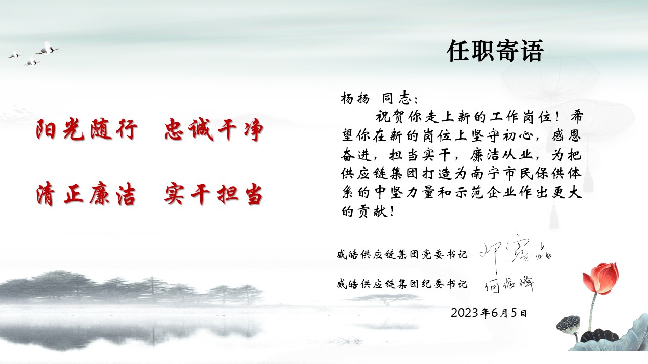 “XX同志:祝賀你走上新的工作崗位!希望你在新的崗位上堅(jiān)守初心,感恩奮進(jìn),擔(dān)當(dāng)實(shí)干,廉潔從業(yè),為把供應(yīng)鏈集團(tuán)打造為南寧市民保供體系的中堅(jiān)力量和示范企業(yè)作出更大的貢獻(xiàn)!”2023年6月5日下午,威皓供應(yīng)鏈集團(tuán)首發(fā)力第一時(shí)間為整合重組調(diào)整的24名中層管理人員開具任職提醒“第一配方”,通過電子卡形式送上祝福、寄語期望、以廉潤心,警醒新任職的中層管理人員清醒任職、廉潔履職,為履新人員扣好“第一??圩印薄!傲佳砸?..