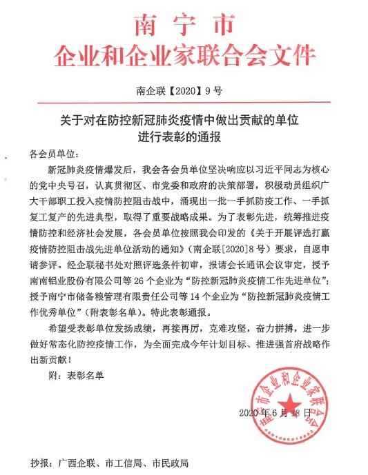 近日,從南寧市企業(yè)和企業(yè)家聯(lián)合會傳來喜訊,南寧威寧集團(tuán)、南寧百貨大樓公司、威寧生態(tài)園公司喜獲“防控新冠疫情工作先進(jìn)單位”;儲備糧公司、天恒電影公司、威寧捷信公司、威寧酒店公司喜獲“防控新冠疫情工作優(yōu)秀單位”。